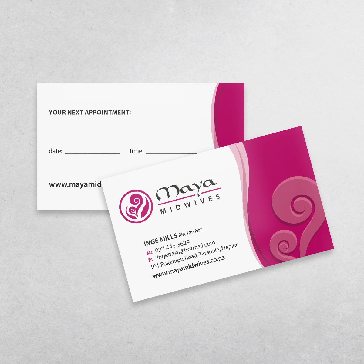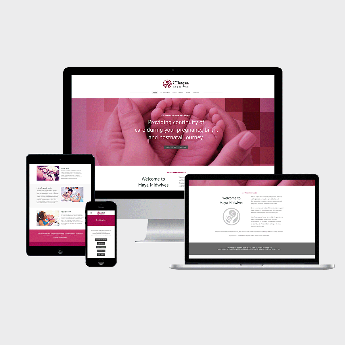 Maya Midwives is a group of independent midwives practicing in Hawke’s Bay. When they came to TK:DESIGN they were in need of not just a brand, but a name as well. A good name should be meaningful, easy to spell and memorable. We developed a creative brief and went to work. The name Maya comes from Maia, which is the Greek word for midwife as well as the Greco-Roman goddess for spring and birth. As the midwives operate somewhat independently and in different areas of the Bay, they each represent themselves with a different colour.